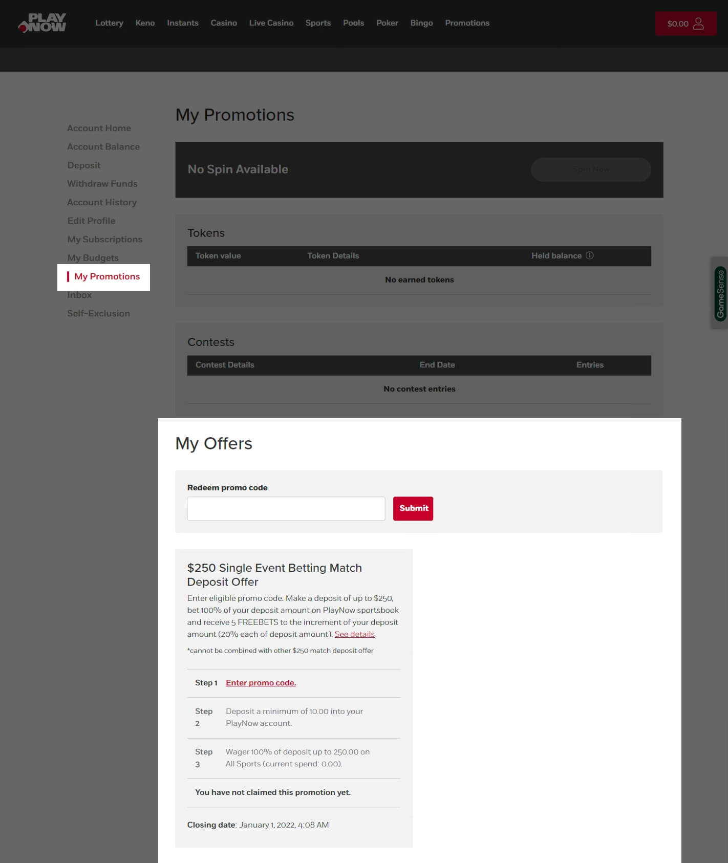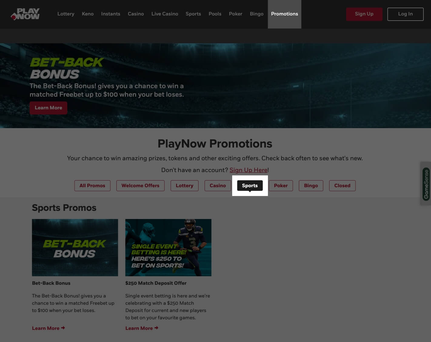 First, log in with your user ID and password by clicking the 'LOG IN' button in the top right corner of the page. If you don’t have an account with PlayNow.com, click JOIN, it's free and only takes a few minutes.